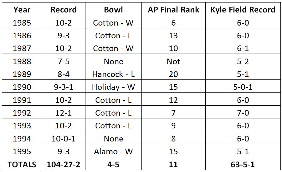 For me there was a decade of Aggie Football in recent memory that was borderline great that I think Aggie Football can get back to with the right head coach. College football is cyclical but there’s a decade of Aggie Football that should the standard by which Aggie Football is judged. That decade is from 1985 to 1995. 20-30 years ago seems like a distant memory now but it should be a reminder of what’s possible.