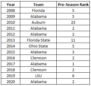 For fun I went back and looked at the national championship winners since 2008. In 6 of those 13 seasons a team with a pre-season ranking of 5 or worse won the national title. The most recent team to win a national title with a pre-season ranking of 5 or worse? The 2019 LSU football team who had a pre-season rank of 6.