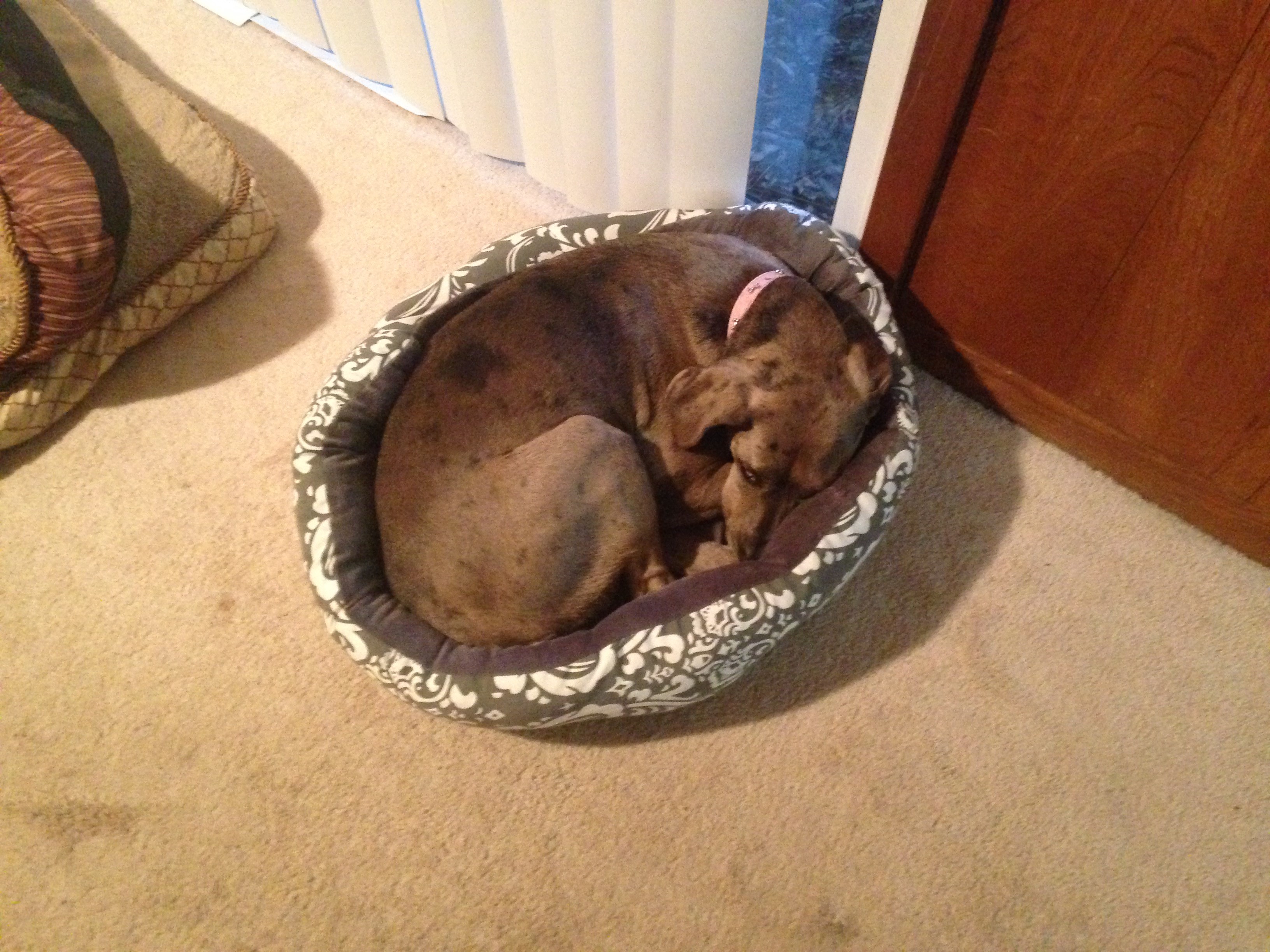 When she slept in my bed Sterling would get up several times through the night and get closer to me. She would basically lay on top of me and I’d slide away from her. At least 4-5 times a night she’d get up, do this little circle thing, and then fall back down as close as she could get to me. If she didn’t feel enough pressure from me she’d make sure she got it. It was all about the snuggles for her.